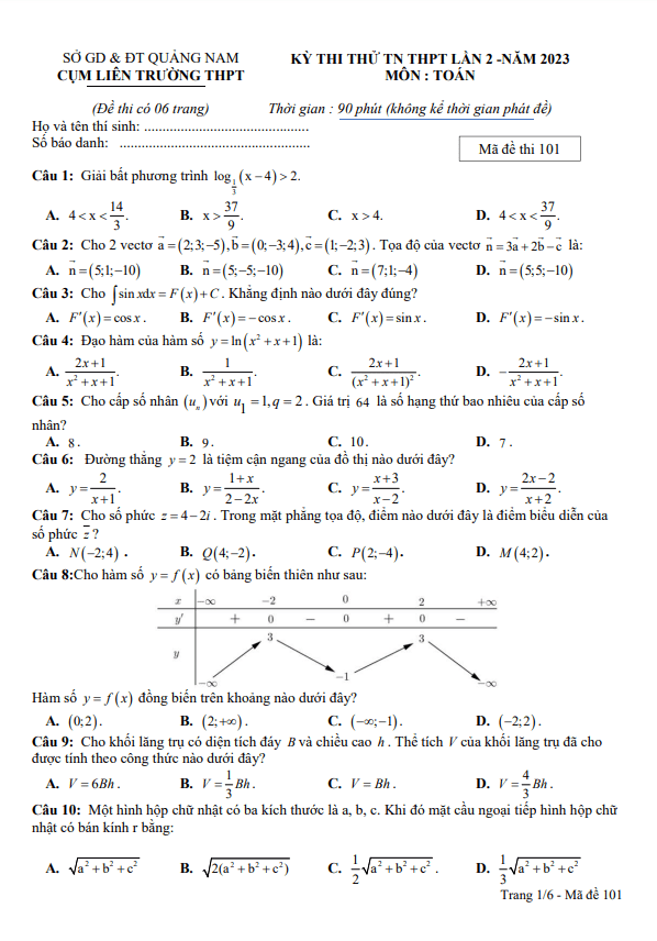 Đề thi thử TN THPT 2023 môn Toán lần 2 cụm liên trường THPT – Quảng Nam