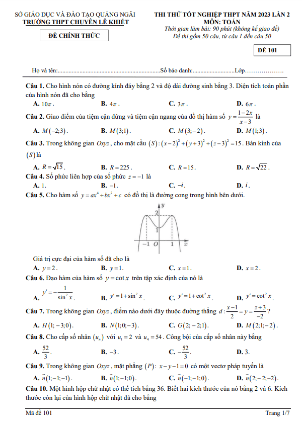 Đề thi thử Toán TN THPT 2023 lần 2 trường chuyên Lê Khiết – Quảng Ngãi