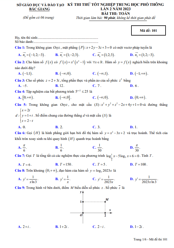 Đề thi thử tốt nghiệp THPT 2023 môn Toán lần 2 sở GD&ĐT Bắc Giang