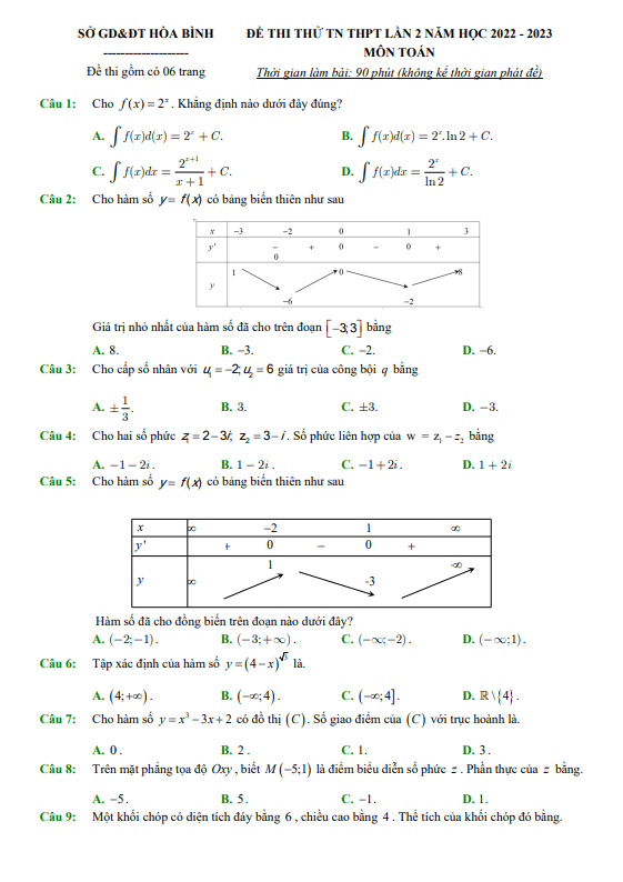 Đề thi thử tốt nghiệp THPT 2023 môn Toán lần 2 sở GD&ĐT Hòa Bình