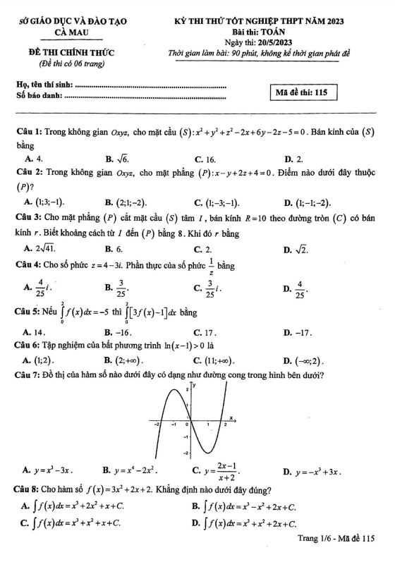Đề thi thử tốt nghiệp THPT năm 2023 môn Toán sở GD&ĐT Cà Mau