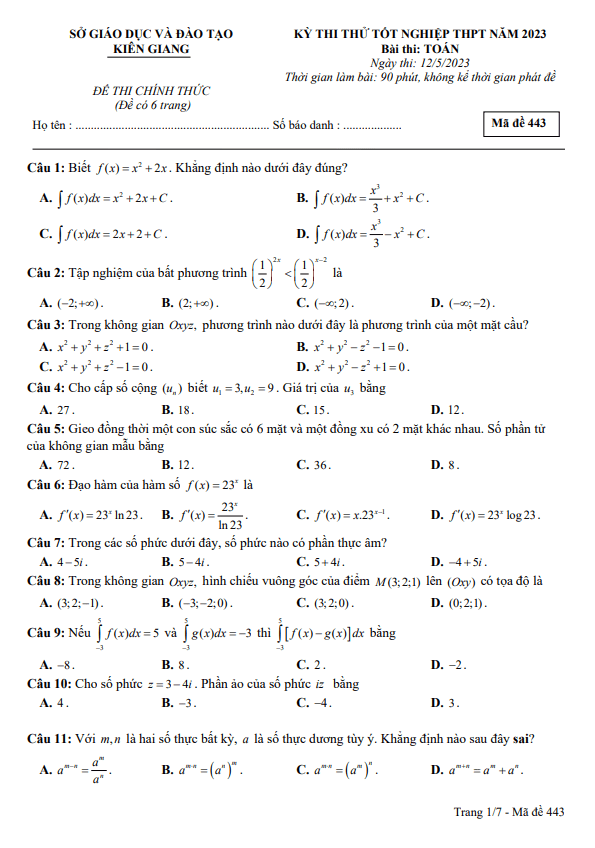 Đề thi thử tốt nghiệp THPT năm 2023 môn Toán sở GD&ĐT Kiên Giang