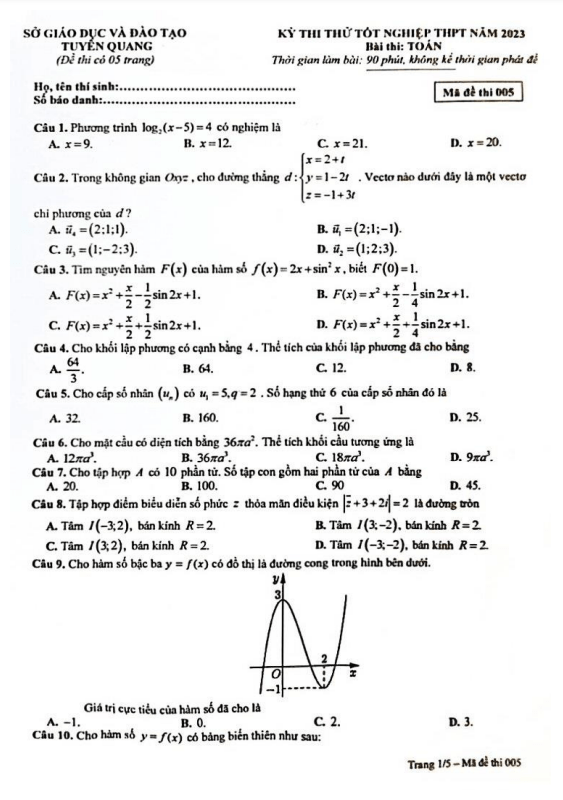 Đề thi thử tốt nghiệp THPT năm 2023 môn Toán sở GD&ĐT Tuyên Quang