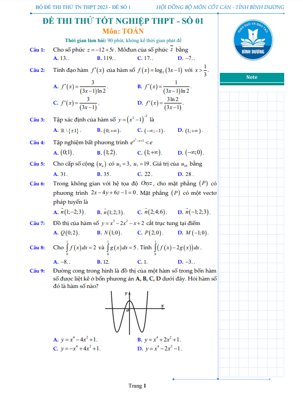 Bộ đề thi thử tốt nghiệp THPT 2023 môn Toán sở GD&ĐT Bình Dương
