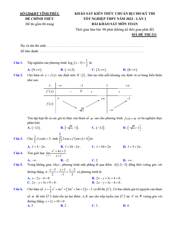 Đề khảo sát môn Toán thi tốt nghiệp THPT 2023 lần 2 sở GD&ĐT Vĩnh Phúc