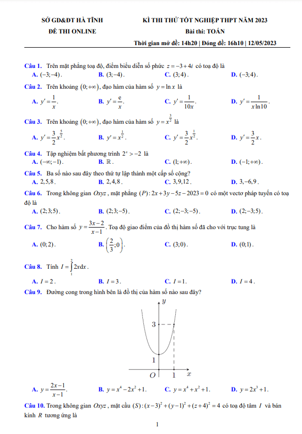 Đề thi thử TN THPT 2022 – 2023 môn Toán sở GD&ĐT Hà Tĩnh (online lần 2)