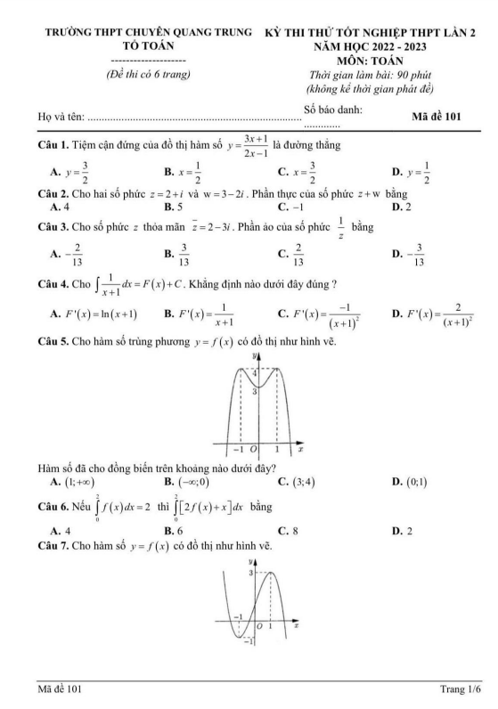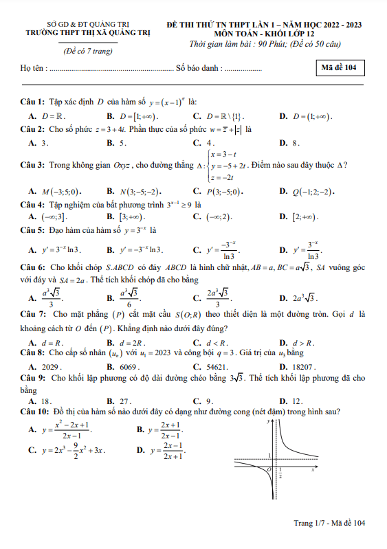Đề thi thử TN THPT 2023 môn Toán lần 1 trường THPT Thị xã Quảng Trị