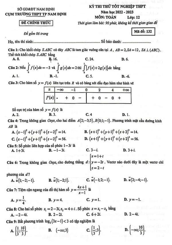 Đề thi thử tốt nghiệp THPT 2023 môn Toán cụm trường THPT TP Nam Định