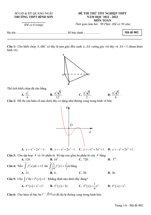 Đề thi thử tốt nghiệp THPT 2023 môn Toán trường THPT Bình Sơn – Quảng Ngãi