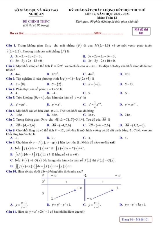 Đề thi thử tốt nghiệp THPT năm 2023 môn Toán sở GD&ĐT Nghệ An