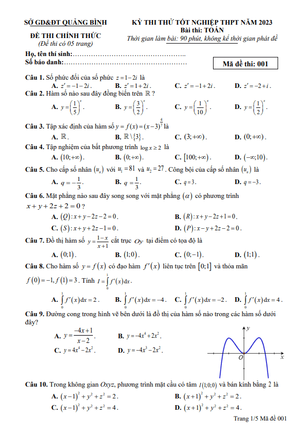 Đề thi thử tốt nghiệp THPT năm 2023 môn Toán sở GD&ĐT Quảng Bình