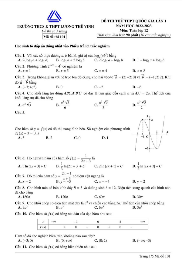 Đề thi thử THPT Quốc gia 2023 môn Toán lần 1 trường Lương Thế Vinh – Hà Nội