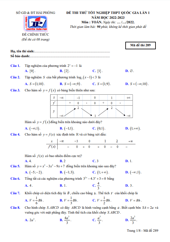 Đề thi thử Toán tốt nghiệp THPT 2023 lần 1 trường chuyên Trần Phú – Hải Phòng