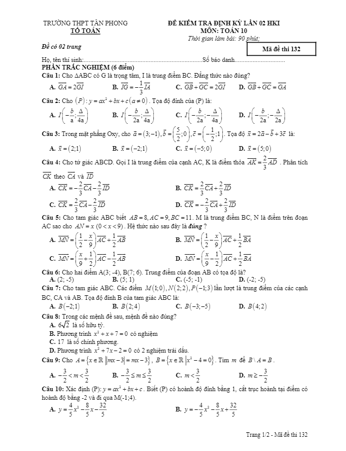 Đề kiểm tra định kỳ lần 2 HK1 Toán 10 trường THPT Tân Phong – Bạc Liêu
