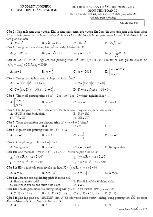 Đề thi KSCL Toán 10 lần 1 năm 2018 – 2019 trường Trần Hưng Đạo – Vĩnh Phúc
