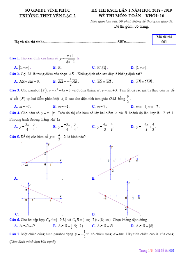 Đề thi KSCL Toán 10 lần 1 năm 2018 – 2019 trường Yên Lạc 2 – Vĩnh Phúc