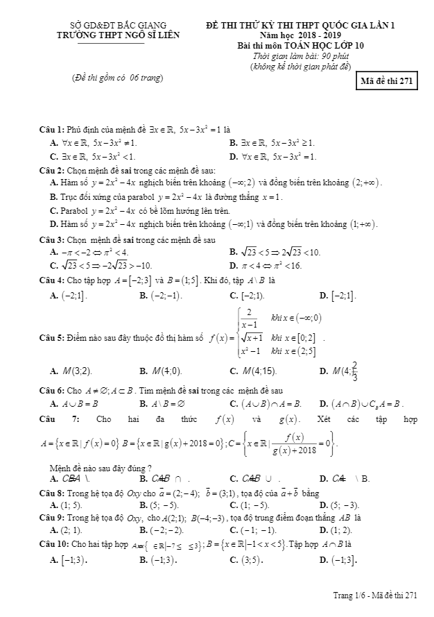 Đề thi thử THPTQG Toán 10 năm 2018 – 2019 lần 1 trường Ngô Sĩ Liên – Bắc Giang