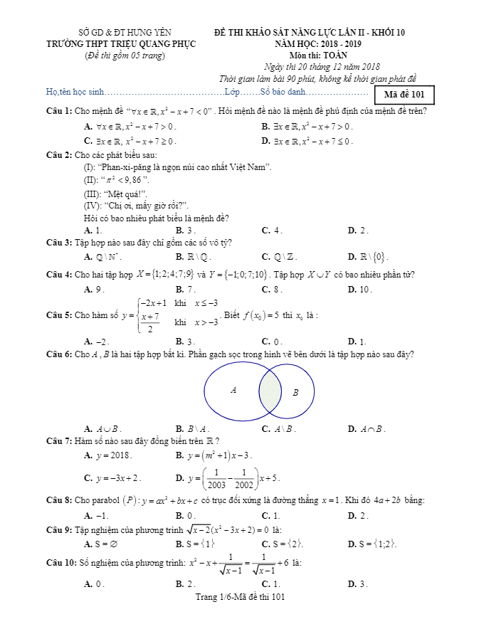 Đề thi khảo sát năng lực Toán 10 lần 1 năm 2018 – 2019 trường Triệu Quang Phục – Hưng Yên