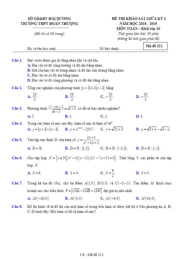 Đề KSCL cuối kỳ 1 Toán 10 năm học 2018 – 2019 trường THPT Đoàn Thượng – Hải Dương