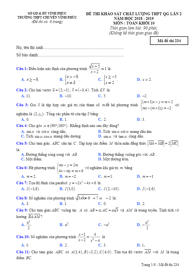 Đề thi KSCL Toán 10 THPT QG lần 2 năm 2018 – 2019 trường THPT chuyên Vĩnh Phúc