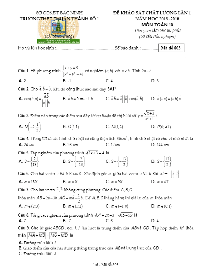 Đề KSCL Toán 10 lần 1 năm 2018 – 2019 trường Thuận Thành 1 – Bắc Ninh