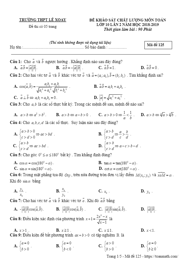 Đề khảo sát Toán 10 lần 2 năm 2018 – 2019 trường THPT Lê Xoay – Vĩnh Phúc