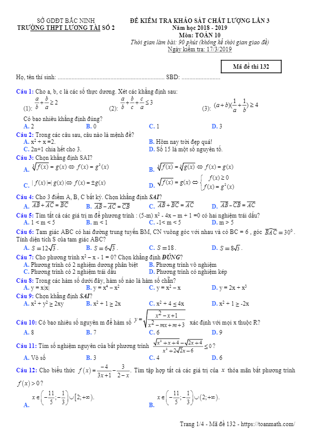 Đề khảo sát Toán 10 lần 3 năm 2018 – 2019 trường Lương Tài 2 – Bắc Ninh