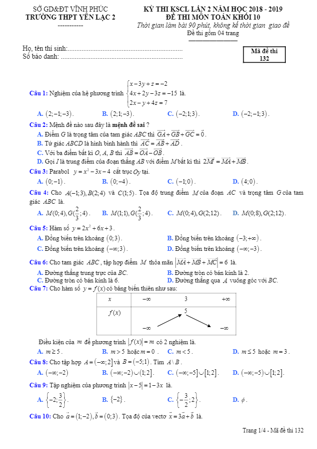 Đề thi KSCL Toán 10 lần 2 năm 2018 – 2019 trường Yên Lạc 2 – Vĩnh Phúc
