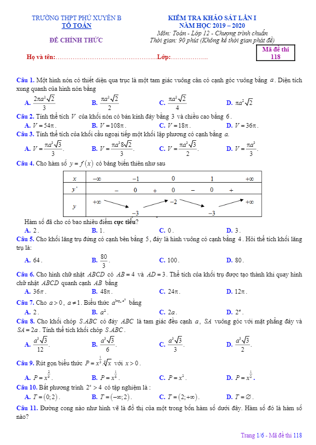 Đề khảo sát lần 1 Toán 12 năm 2019 – 2020 THPT Phú Xuyên B – Hà Nội