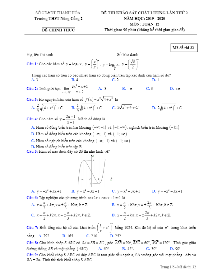 Đề khảo sát Toán 12 lần 2 năm 2019 – 2020 THPT Nông Cống 2 – Thanh Hóa