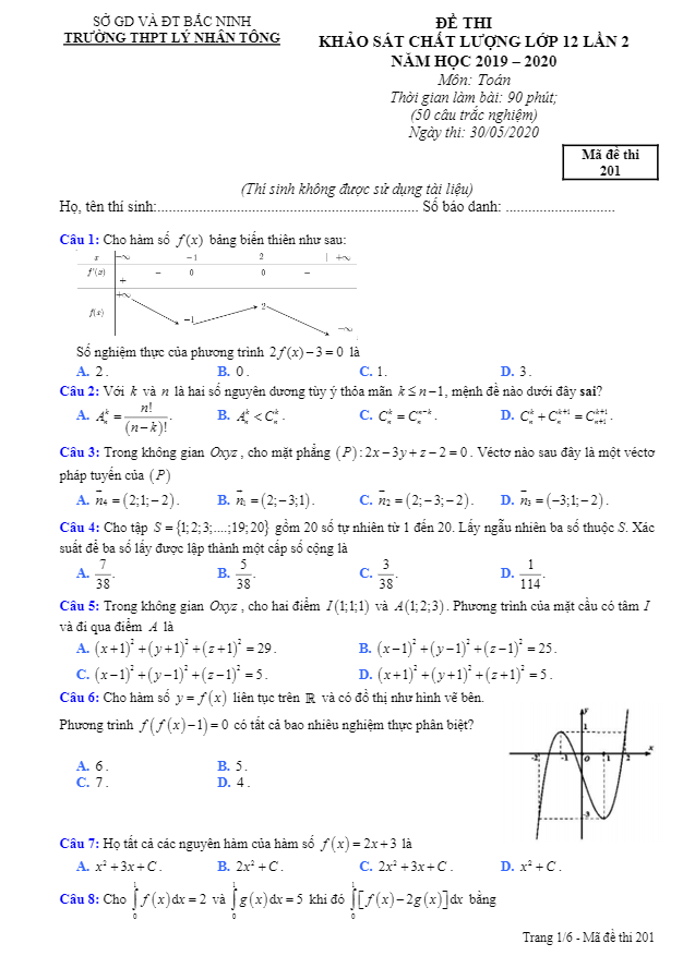 Đề khảo sát chất lượng Toán 12 lần 2 năm 2019 – 2020 trường Lý Nhân Tông – Bắc Ninh