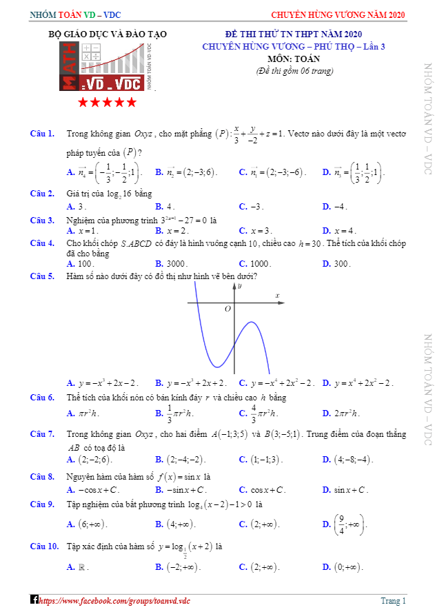 Đề khảo sát Toán 12 năm 2019 – 2020 trường chuyên Hùng Vương – Phú Thọ