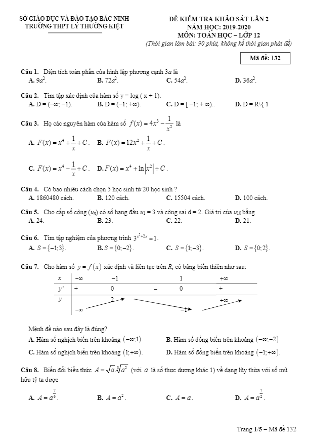 Đề khảo sát Toán 12 lần 2 năm 2019 – 2020 trường THPT Lý Thường Kiệt – Bắc Ninh