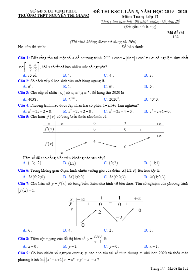 Đề KSCL Toán 12 lần 3 năm 2019 – 2020 trường Nguyễn Thị Giang – Vĩnh Phúc