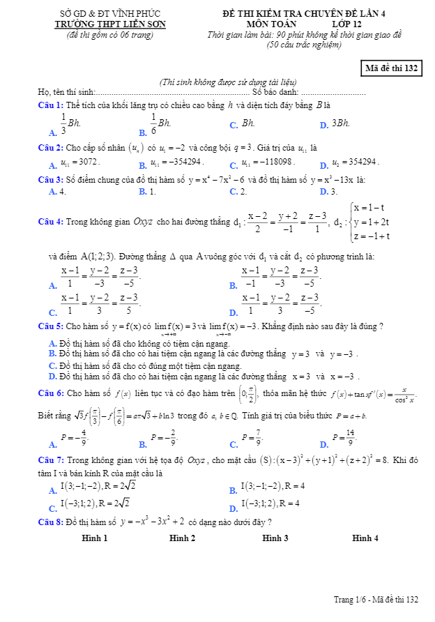 Đề thi chuyên đề Toán 12 lần 4 năm 2019 – 2020 trường THPT Liễn Sơn – Vĩnh Phúc