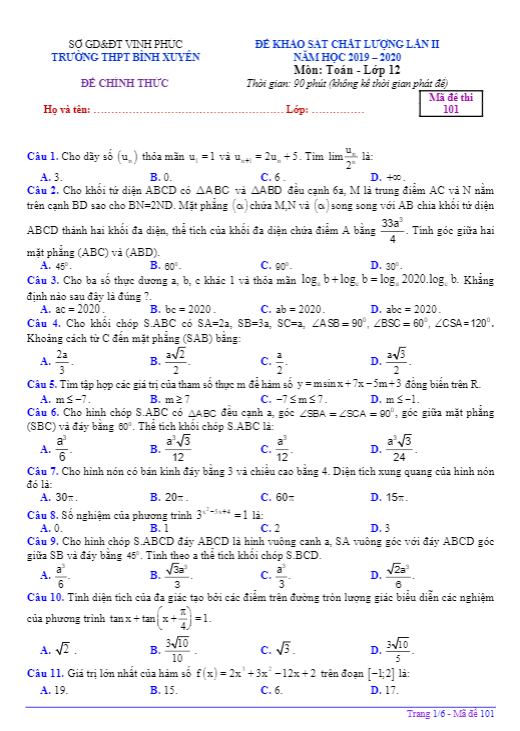 Đề khảo sát lần 2 Toán 12 năm 2019 – 2020 trường Bình Xuyên – Vĩnh Phúc