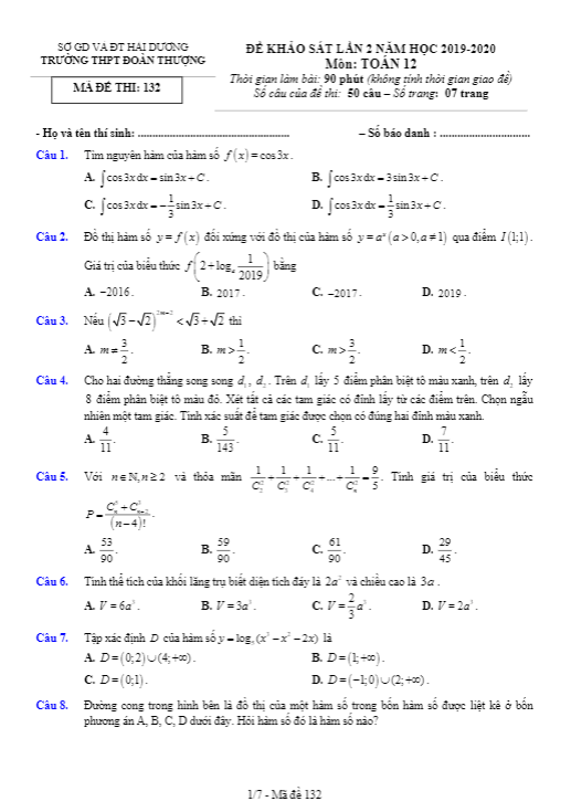Đề khảo sát lần 2 Toán 12 năm 2019 – 2020 trường Đoàn Thượng – Hải Dương