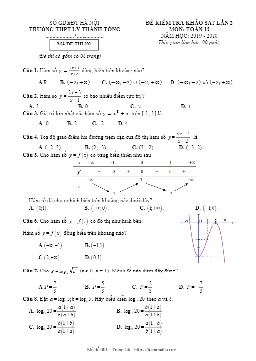 Đề khảo sát Toán 12 lần 2 năm 2019 – 2020 trường Lý Thánh Tông – Hà Nội
