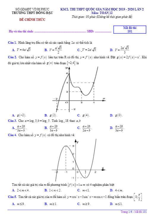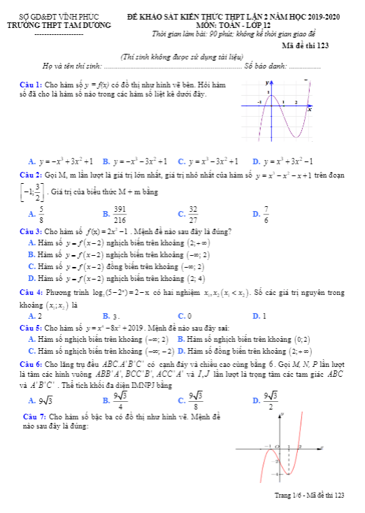 Đề khảo sát Toán 12 lần 2 năm 2019 – 2020 trường Tam Dương – Vĩnh Phúc