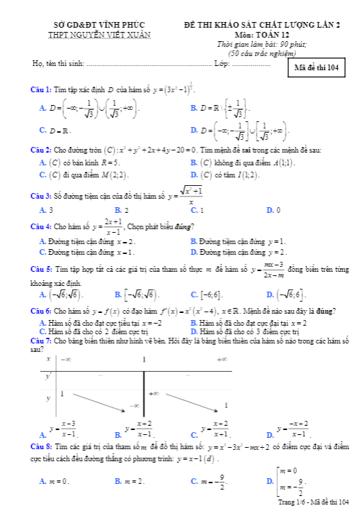 Đề KSCL Toán 12 lần 2 năm 2019 – 2020 trường Nguyễn Viết Xuân – Vĩnh Phúc