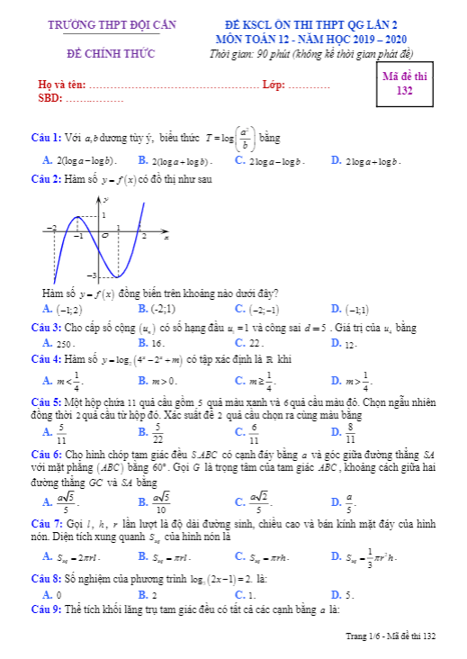 Đề KSCL Toán 12 ôn thi THPTQG 2020 lần 2 trường THPT Đội Cấn – Vĩnh Phúc