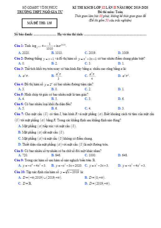 Đề thi chuyên đề Toán 12 lần 2 năm 2019 – 2020 trường Ngô Gia Tự – Vĩnh Phúc