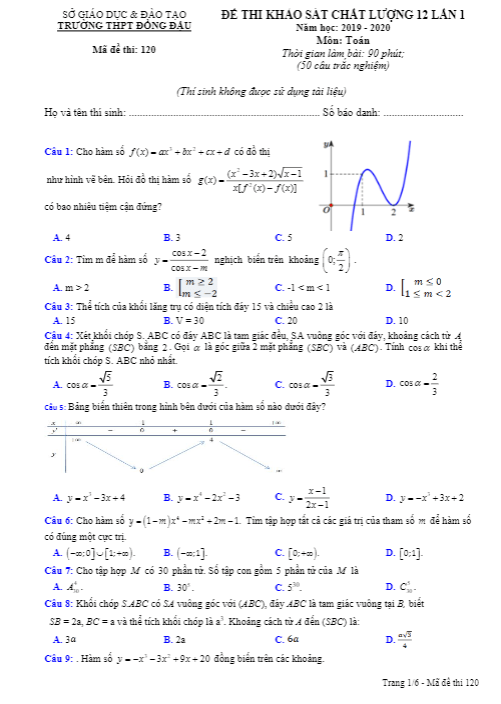 Đề khảo sát chất lượng Toán 12 lần 1 năm 2019 – 2020 trường Đồng Đậu – Vĩnh Phúc