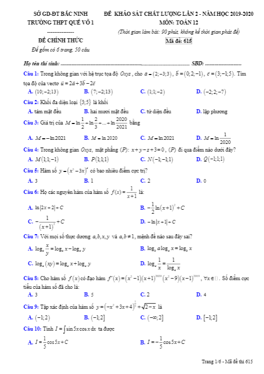 Đề khảo sát chất lượng Toán 12 lần 2 năm 2019 – 2020 trường Quế Võ 1 – Bắc Ninh