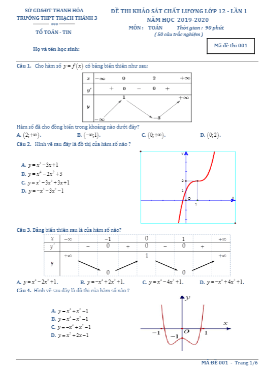 Đề khảo sát Toán 12 lần 1 năm 2019 – 2020 trường Thạch Thành 3 – Thanh Hóa