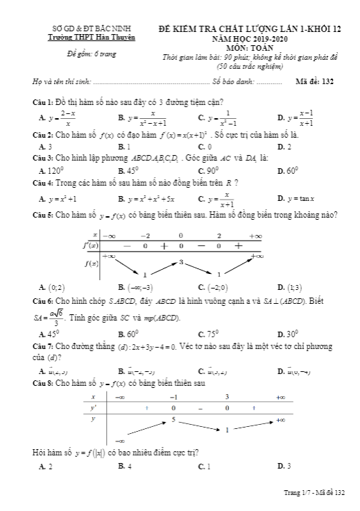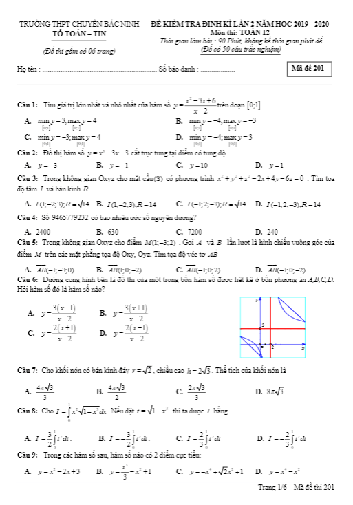Đề kiểm tra chất lượng Toán 12 lần 1 năm 2019 – 2020 trường Hàn Thuyên – Bắc Ninh