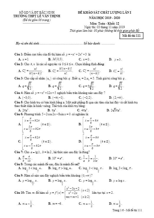Đề KSCL Toán 12 lần 1 năm học 2019 – 2020 trường Lê Văn Thịnh – Bắc Ninh