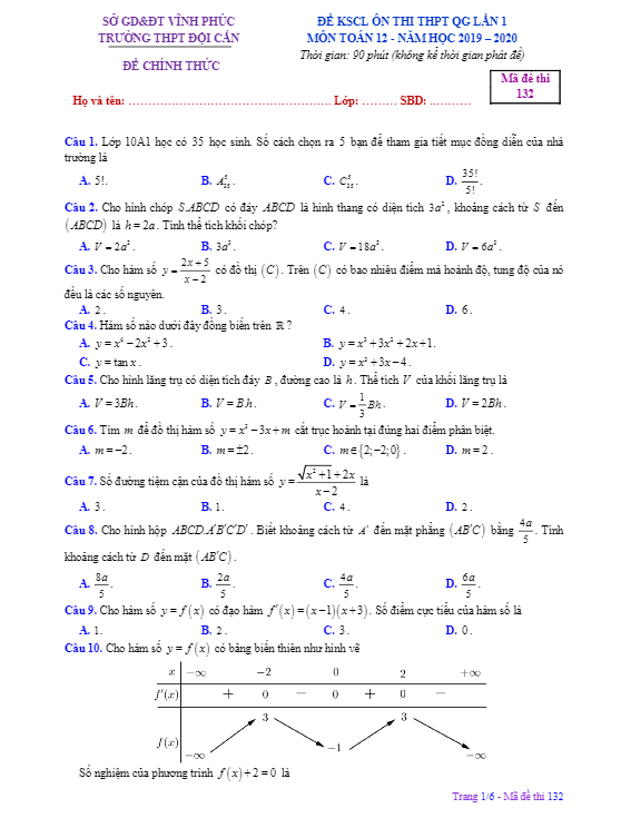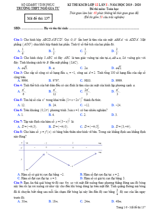 Đề khảo sát chất lượng Toán 12 lần 1 năm 2019 – 2020 trường Lê Xoay – Vĩnh Phúc