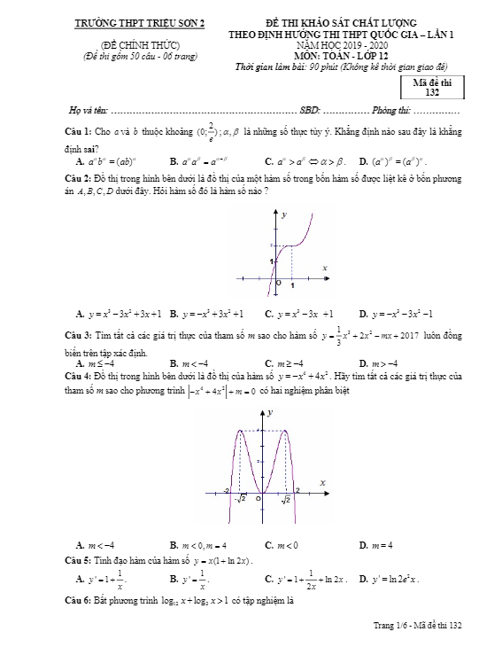 Đề KSCL Toán 12 lần 1 ôn thi THPTQG 2020 trường Triệu Sơn 2 – Thanh Hóa