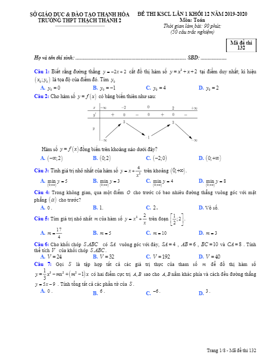 Đề thi KSCL lần 1 Toán 12 năm 2019 – 2020 trường Thạch Thành 2 – Thanh Hóa